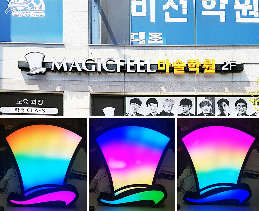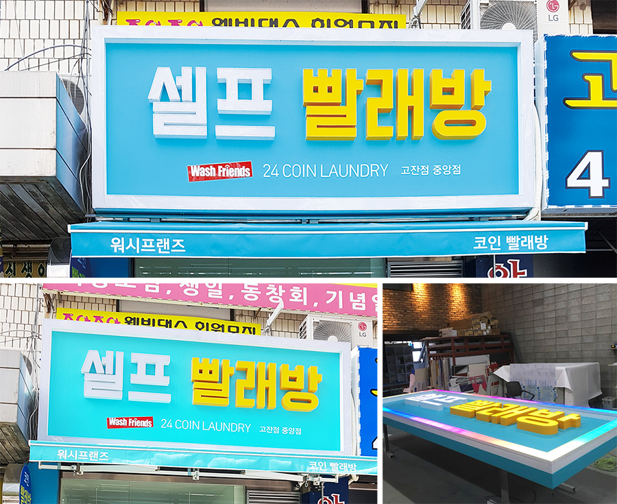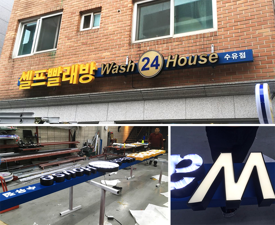 현재 가장 선호도가 높은 간판으로 플렉스 간판에 비해 표현이 제한적이고 제작 비용이 많이 들어가지만 장기적으로 사용했을 때 전기세가 LED 조명이 형광등에 비해 80% 이상 절감되고 야간에 불을 켜면 낱글자마다 조명이 들어와 광고효과가 좋으며, LED 조명이 반영구적이기 때문에 유지보수 비용이 절감된다는 점이 가장 큰 장점입니다. LED 채널은 업종에 제한없이 무난하면서 심플한 간판입니다.