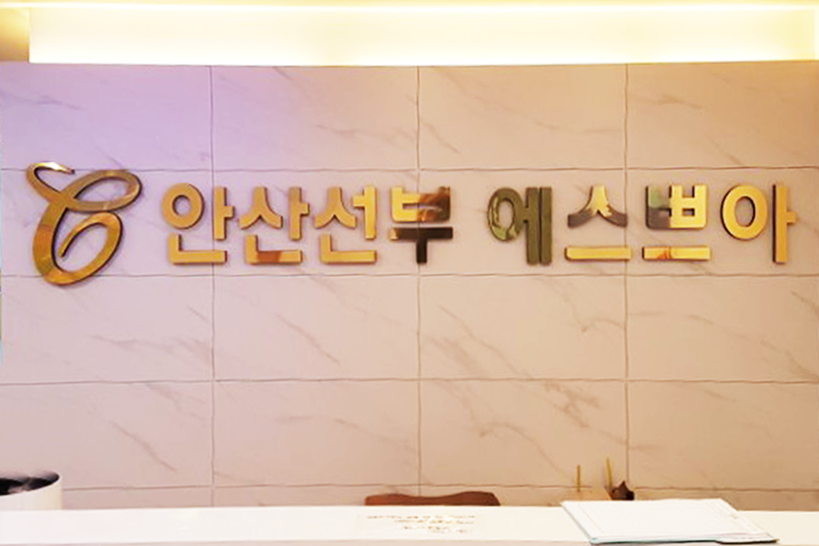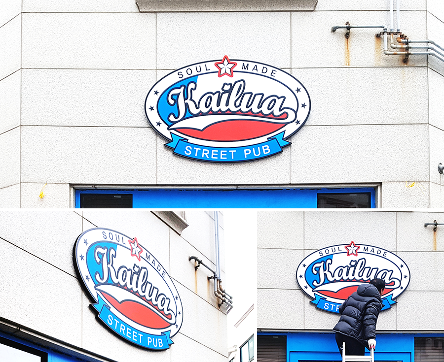 다양한 색상과 저렴한 비용으로 입체효과를 낼 수 있다는 것이 가장 큰 장점입니다. 하지만 고무 스카시 자체가 비조명용이기 때문에 야간에도 사용하기 위해서는 조명을 따로 설치하여 비춰줘야 한다는 단점이 있습니다. 조명을 설치하여 비춰지면 그림자가 생겨 나름의 은은한 분위기가 있습니다.